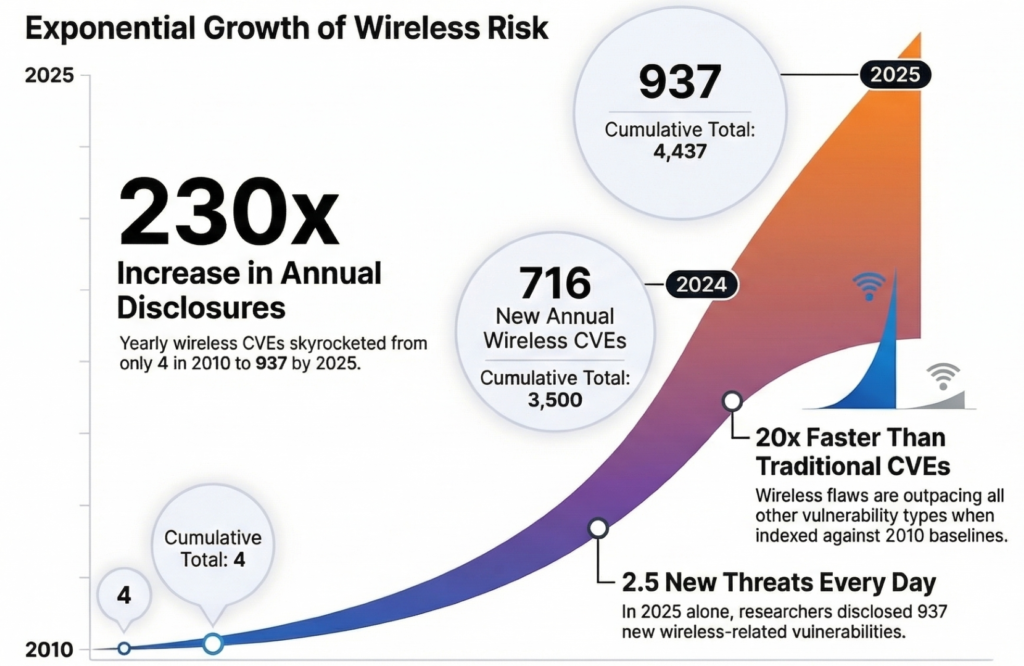 - Daily Threat Velocity: In 2025 alone, researchers disclosed 937 new wireless CVEs, averaging 2.5 new vulnerabilities discovered every day.