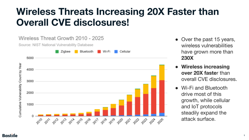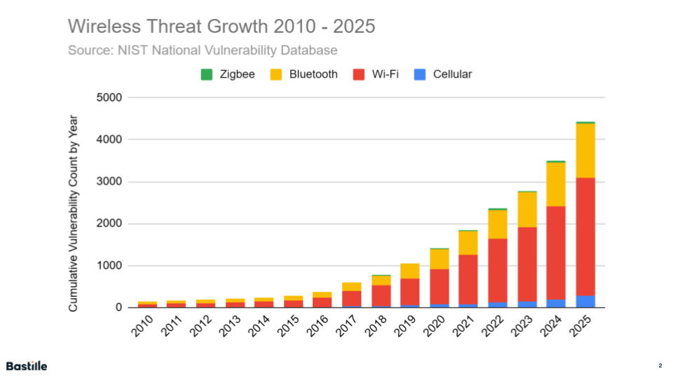 “What we’re seeing in the data is not a short-term spike but a structural shift in the threat landscape,” said Dr. Brett Walkenhorst, principal researcher and CTO at Bastille Networks. “Wireless vulnerabilities have grown more than 230-fold since 2010 and are accelerating far faster than the overall CVE ecosystem. Because many of these vulnerabilities affect shared chipsets, protocol stacks, and embedded systems that remain in service for years, each year’s disclosures compound a growing base of persistent exposure for enterprises.”